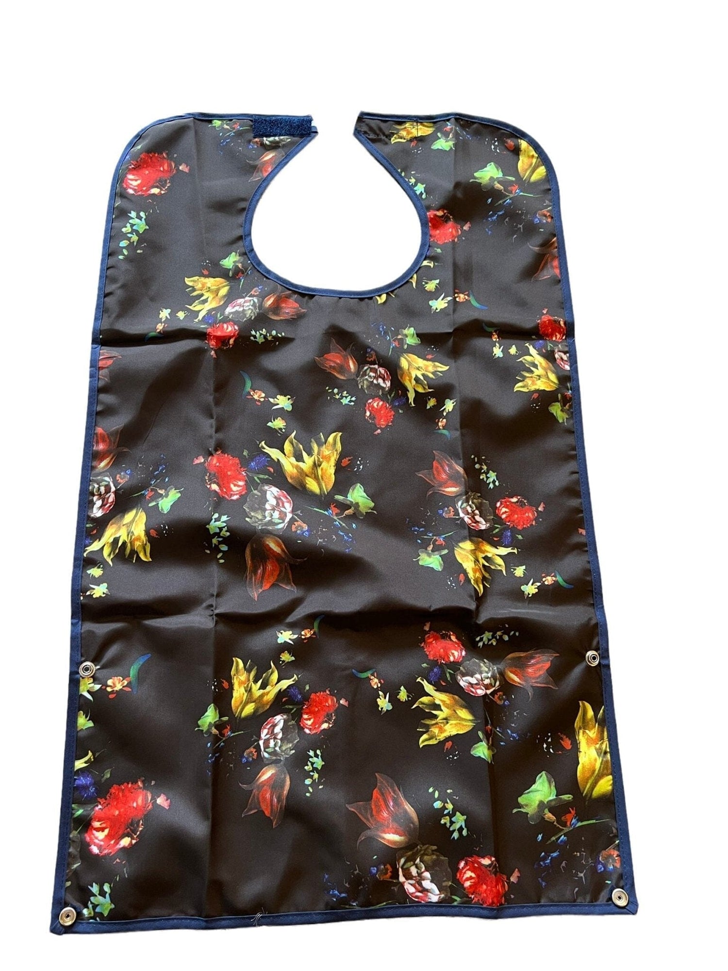 Den är designad med ett veck i botten, så att eventuell matrester inte faller på plagget. Den fästs enkelt och enkelt i nacken med hjälp av kardborreband.