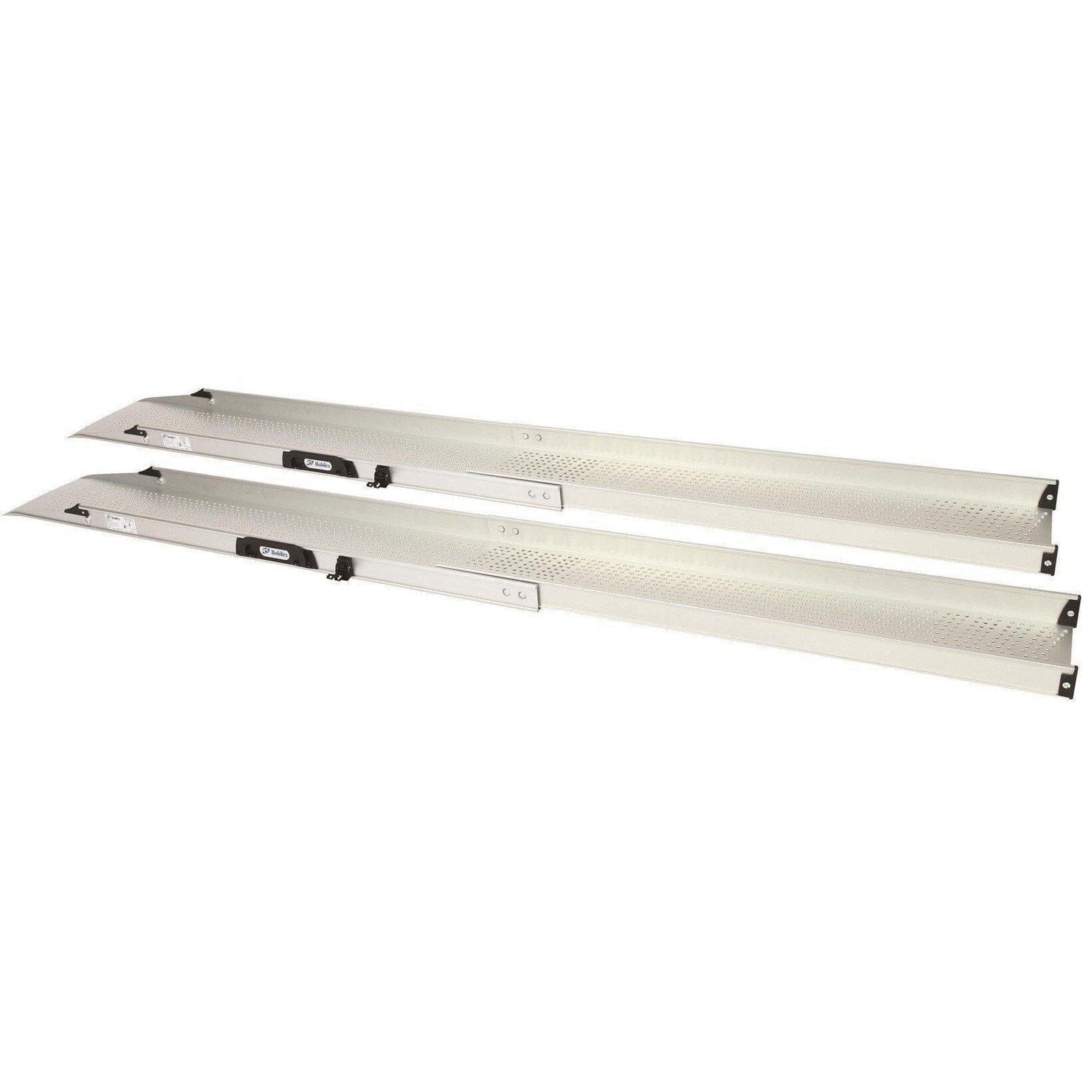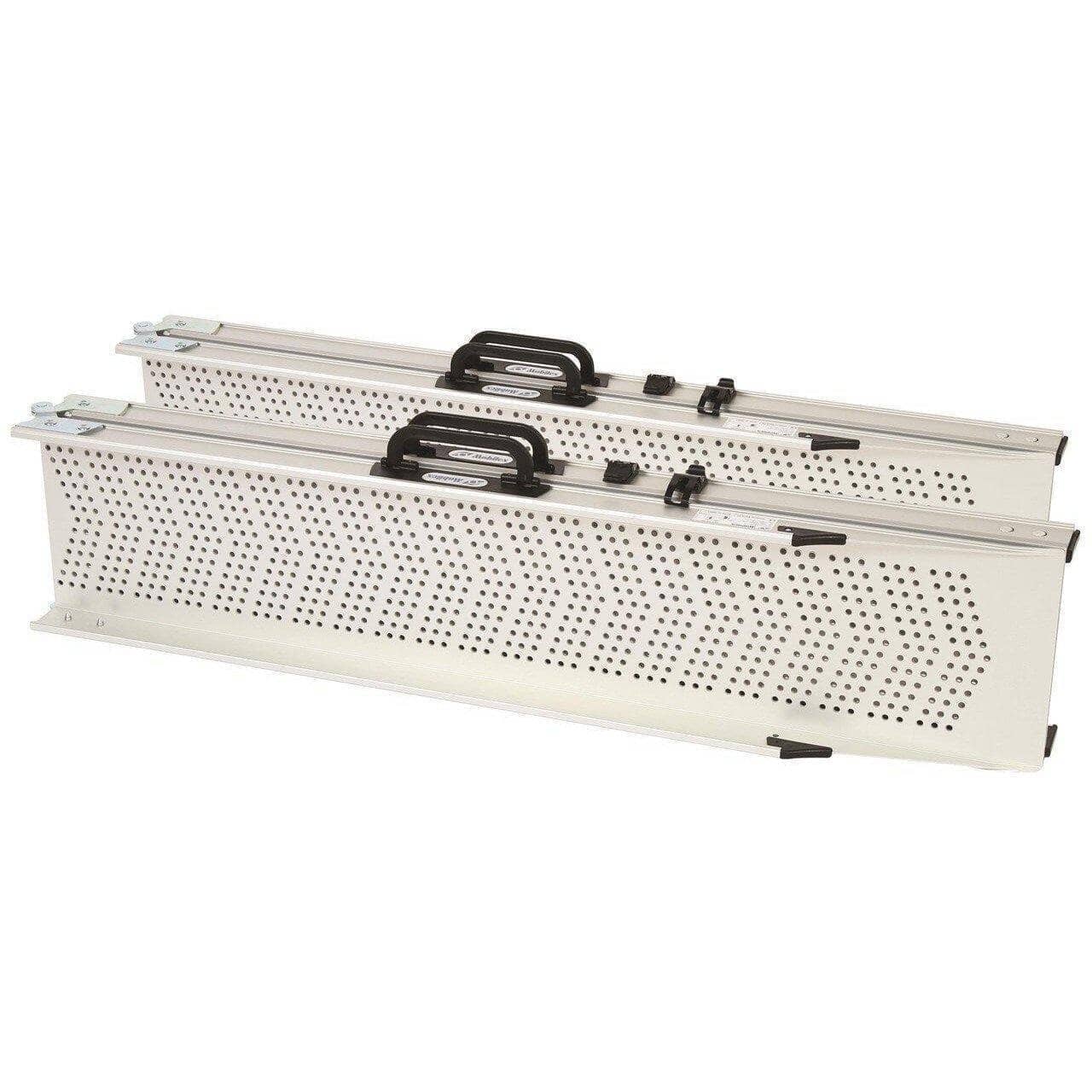 Rullstolsramperna är gjorda av aluminium och är en av våra favoritlättviktsmodeller. De perforerade och grova spåren ger en bra balans mellan vikt och styrka och ser till att det inte finns vatten på ramperna.