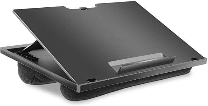 Ultralätt arbetsbord i kraftig svart plast. Många smarta funktioner. Med mjuka kuddar på undersidan. Passar vanliga Macbook, samt PC och Ipads upp till 15,6" (39 cm).