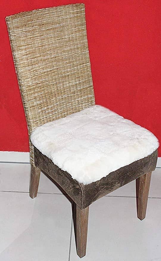Sitsen är designad i 3 lager: sitsöverdraget är i äkta lammskinn, 1,5 cm skum i mitten och med tyg undersida. Lammskinnet är en naturprodukt, och den har funktionen att dynan alltid andas, temperaturreglerar och är skön att sitta på, oavsett årstid. – Ingen svett och ingen kyla.