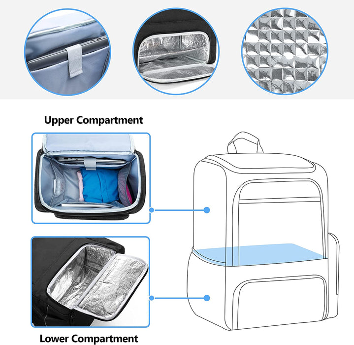 Det nedre facket med inbyggd termos kan förvara lunchpaket, frukt mm. Materialet är tillverkat med värmeisoleringsmaterial, så du har både möjlighet att hålla din mat varm och fräsch, samt att hålla dina kylvaror kalla.