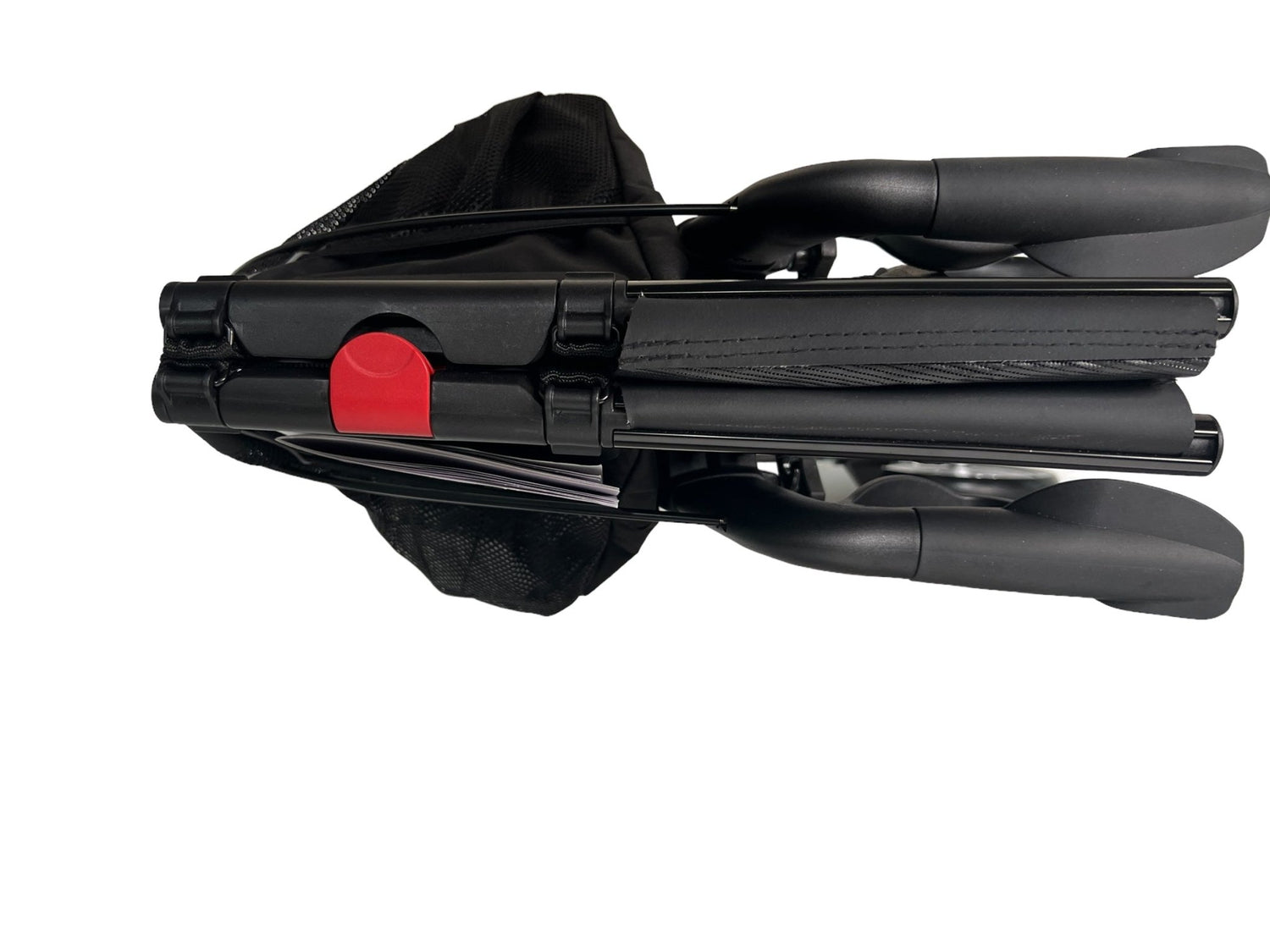 Når du skal folde din rollator sammen, trækker du blot i stroppen, der er monteret på sædet. Når sædet er trukket opad, presser du blot rollatoren sammen, og du aktiverer derved automatisk det helt særlige låsesystem, der følger med denne model. Du kan se de to røde låse på hver side af sædet. Når siderne presses sammen, så ”klikker” låsen sikkert fast, og du er derved sikret, at din rollator ikke pludselig folder sig ud under transport. Den åbnes først op, når du igen trykker på den røde knap.