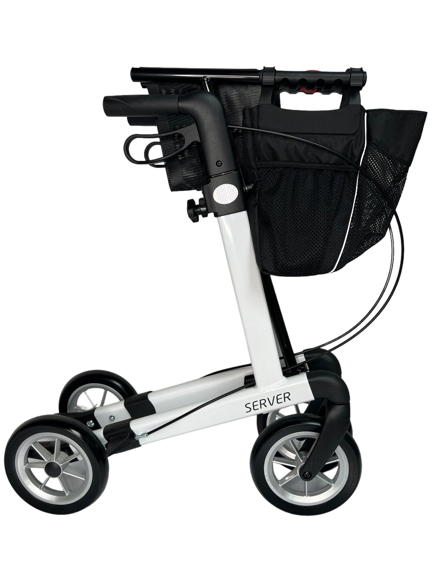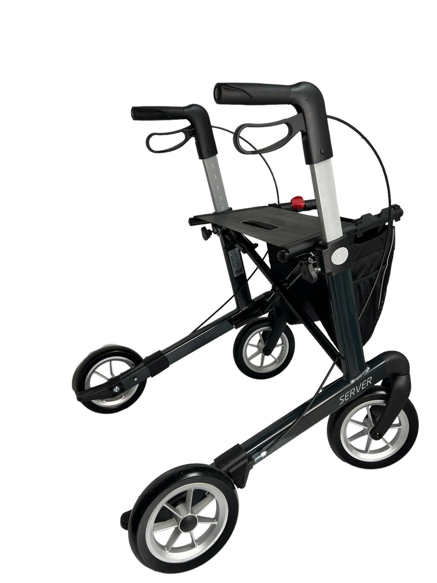 Moderne standard letvægts rollator i aluminium er velegnet til både udendørs og indendørs brug. Den vejer kun 7,1 kg og er let og enkel at klappe sammen sideværts, så den fylder minimalt og du kan let have den med i et almindeligt bagagerum. Stellet er lavet i stærkt aluminium, og det er designet så smart, at sædet skråner fremad, hvor mange andre modeller har et parallelt sæde. Vores SERVER rollatorer er alle monteret med de bløde, punkterfrie og støddæmpende hjul, og ikke de traditionelle flade hårde standard hjul.