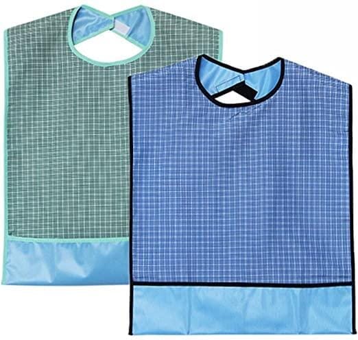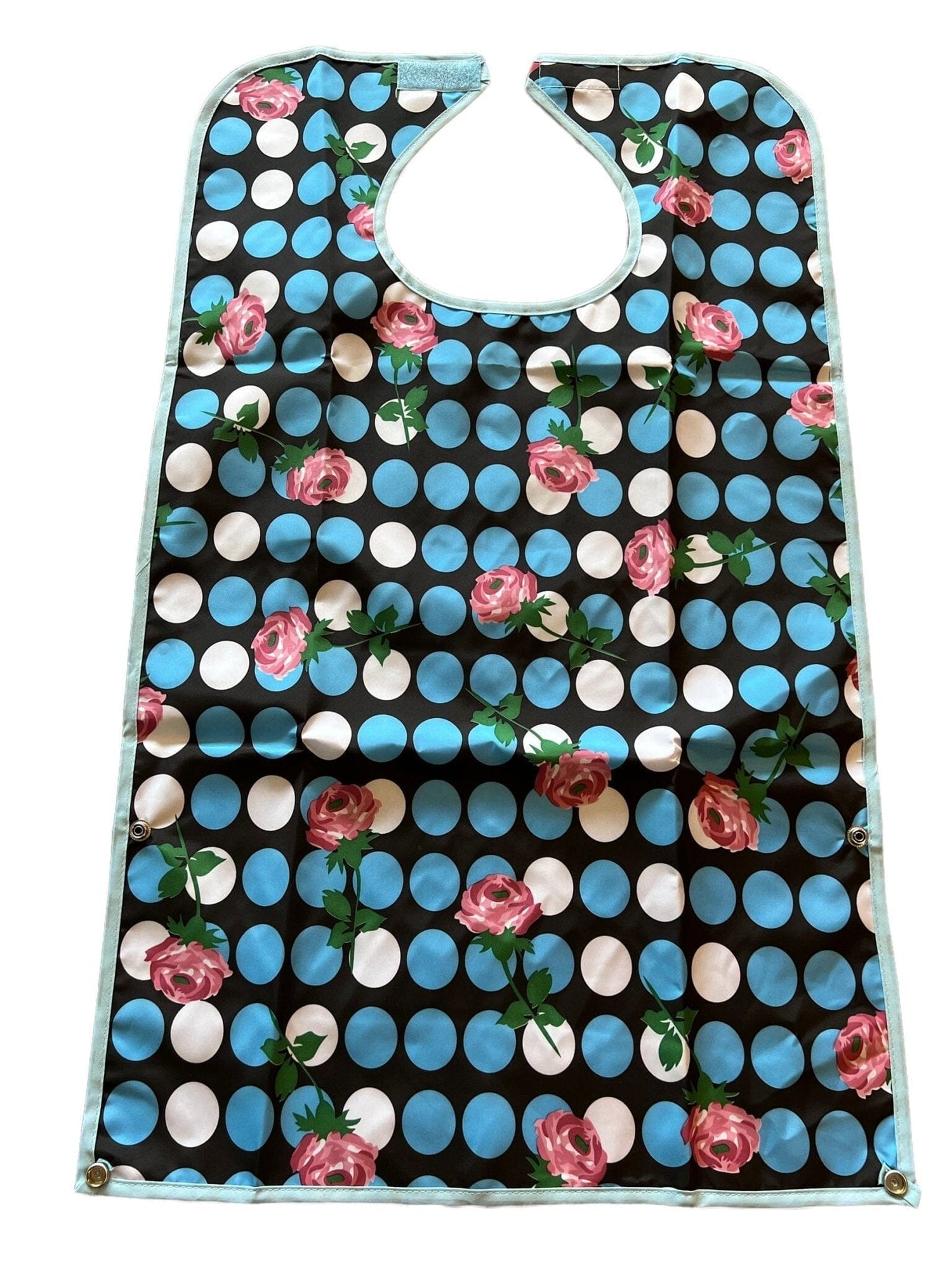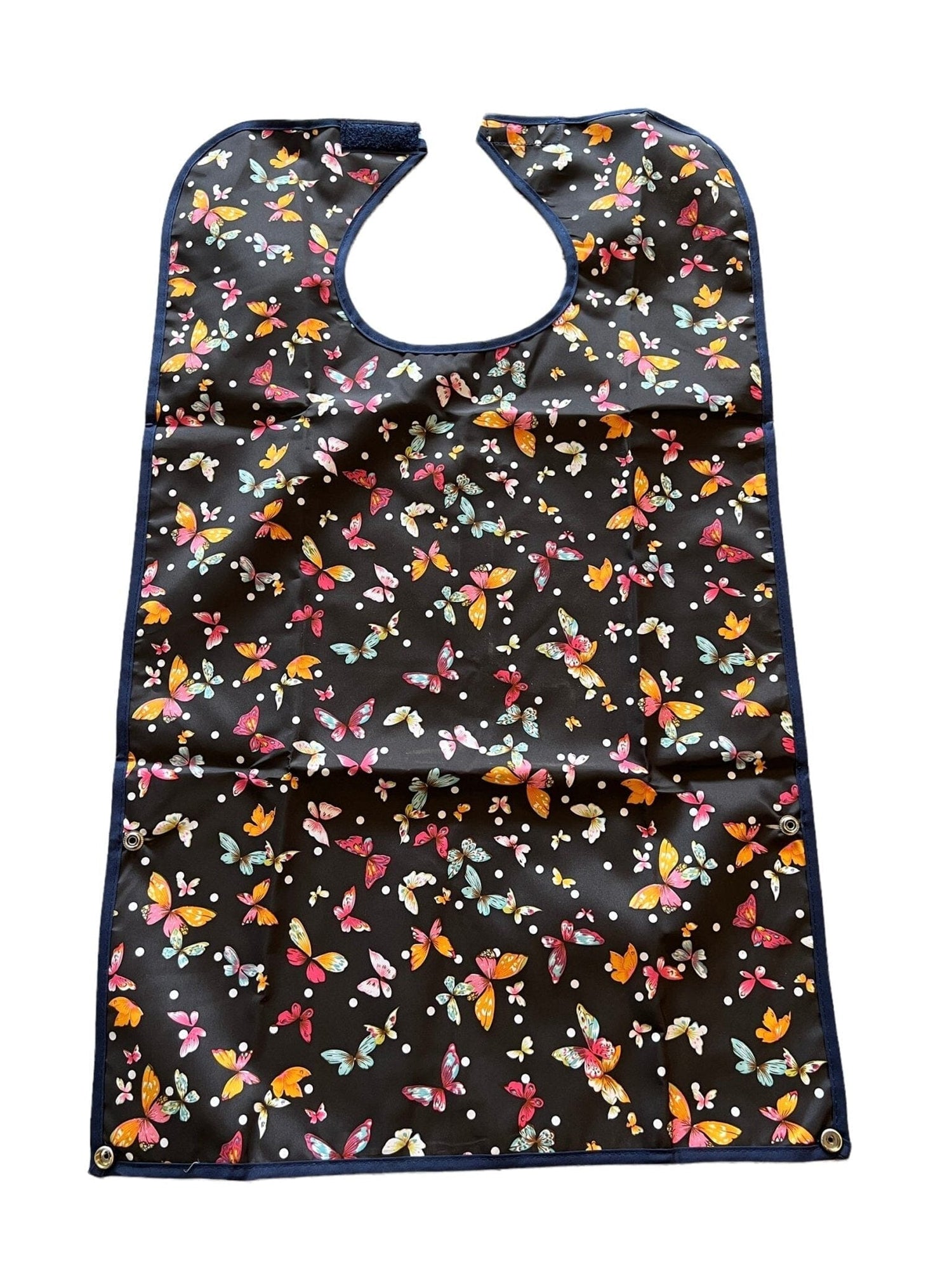 Den är designad med ett veck i botten, så att eventuell matrester inte faller på plagget. Den fästs enkelt och enkelt i nacken med hjälp av kardborreband.